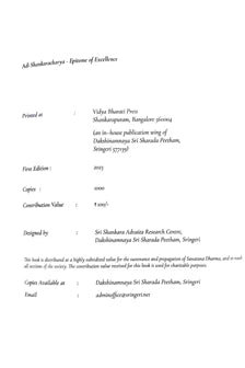 Adi Shankaracharya - Epitome of Excellence delves into the life and teachings of Jagadguru Sri Adi Shankaracharya, as narrated by Sringeri Jagadguru Sri Vidyaranya in the traditional biography Madhaviya Shankara Digvijaya. Spanning 16 cantos and 1846 verses, this poetic work rivals the classical works of great poets like Kalidasa, providing a comprehensive account of Adi Shankaracharya's life and teachings. Sri Vidyaranya, renowned for his commentaries on the Vedas and works on Vedanta such as Panchadashi and Jivanmukti Viveka, was instrumental in the founding of the Vijayanagara Empire, which protected Sanatana Dharma and preserved dharmic culture in southern India. This book highlights 32 virtues of Adi Shankaracharya, corresponding to the 32 years of his life, offering invaluable lessons from his illustrious journey. Through the verses of Madhaviya Shankara Digvijaya, readers gain insight into the profound character and wisdom of Jagadguru Sri Adi Shankaracharya.
