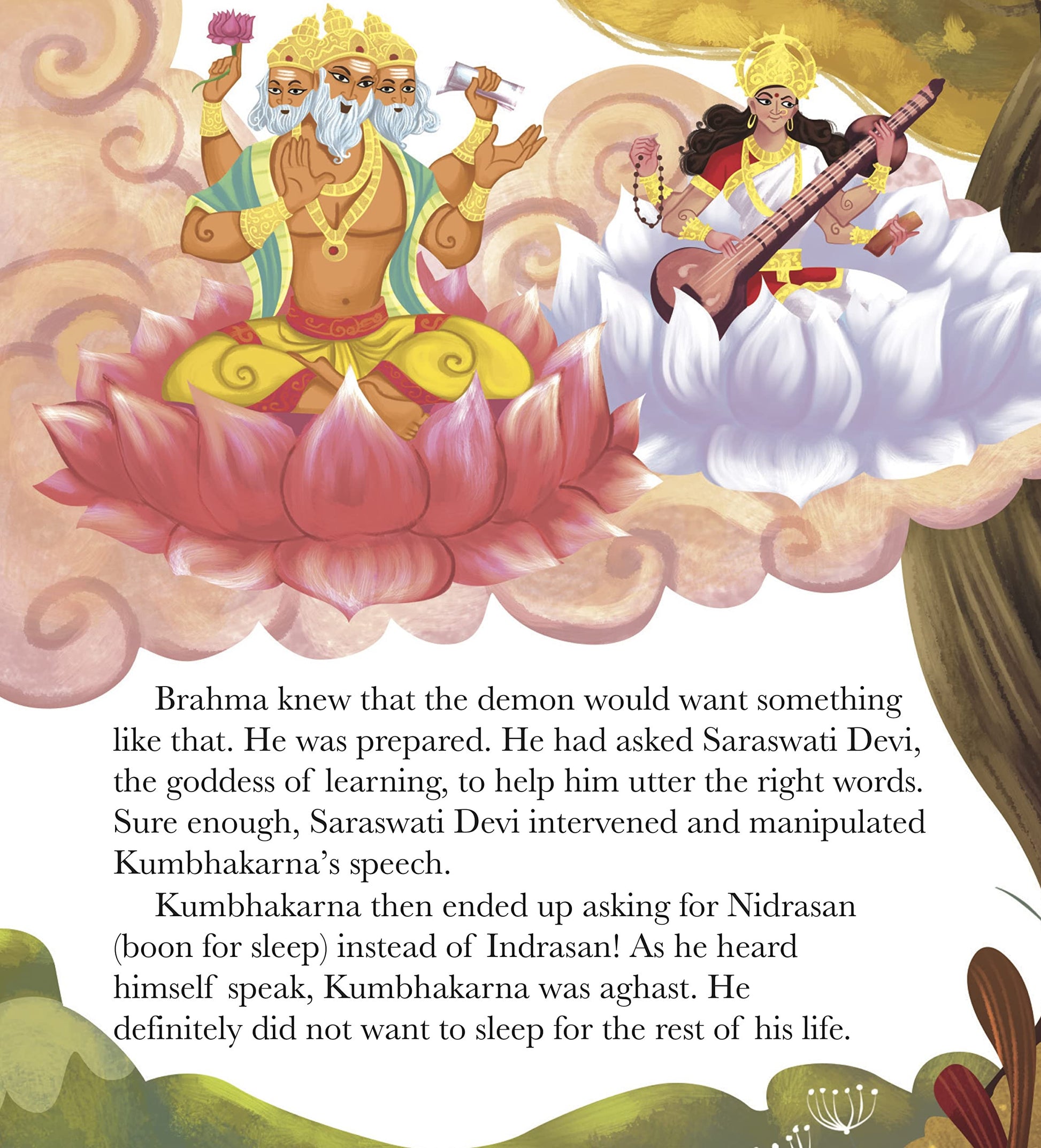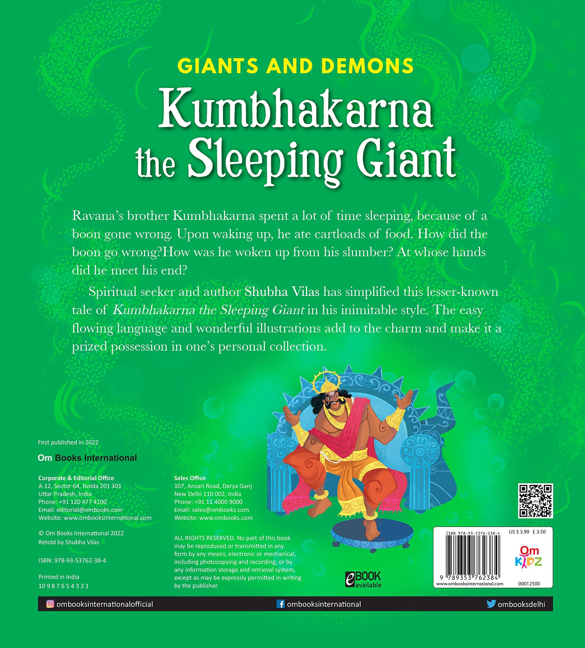 Ravana’s brother Kumbhakarna spent a lot of time sleeping, because of a boon gone wrong. Upon waking up, he ate cartloads of food. How did the boon go wrong?How was he woken up from his slumber? At whose hands did he meet his end? Spiritual seeker and author Shubha Vilas has simplified this lesser-known tale of Kumbhakarna the Sleeping Giant in his inimitable style. The easy flowing language and wonderful illustrations add to the charm and make it a prized possession in one’s personal collection