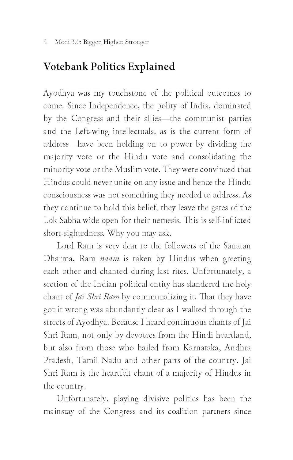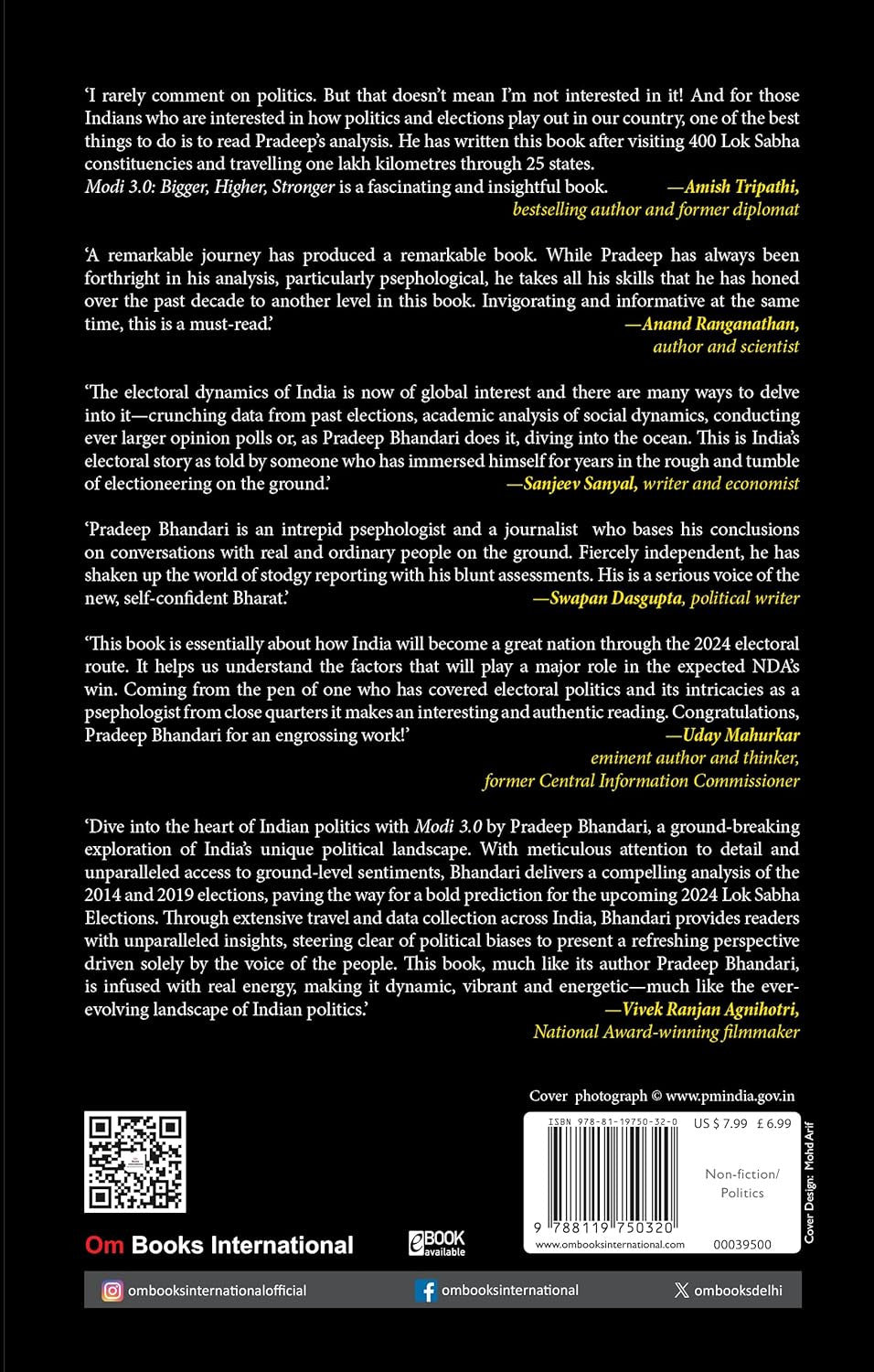 The results of Assembly elections held in Chhattisgarh, Madhya Pradesh and Rajasthan in December 2023 provided a big boost to the Bharatiya Janata Party. They confirmed what is common knowledge: as far as the 2024 parliamentary elections are concerned, the BJP remains firmly in pole position. With the 18th Lok Sabha elections around the corner, the Jan Ki Baat’s team with an unmatched track record of predicting election results has been racing through constituencies conducting public opinion polls and pre-election surveys for the forthcoming elections. The polls re-establish that Prime Minister Narendra Modi’s popularity remains intact. The fragmented Opposition remains no match to India’s most admired leader, most invincible political organization and most savvy marketing machinery. In Modi 3.0, renowned psephologist, journalist and bestselling author Pradeep Bhandari provides an incisive and in-depth account of how India votes and why Narendra Modi remains unchallenged and will return with a bigger, higher and stronger mandate.